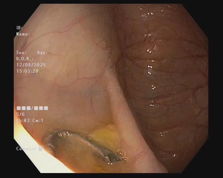 Sau khi tiếp nhận bệnh nhi và chụp X-quang ổ bụng, các bác sĩ đã phát hiện dị vật cản quang trong vùng tiểu khung và có chỉ định nội soi gây mê gắp dị vật. Sau 10 phút gây mê thực hiện thủ thuật, các bác sĩ Khoa tiêu hóa – Huyết học lâm sàng đã lấy thành công dị vật là chiếc móc cài vòng bạc đeo ở tay trẻ. Dị vật sắc nhọn hình móc câu có kích thước khoảng 0.5 cm.