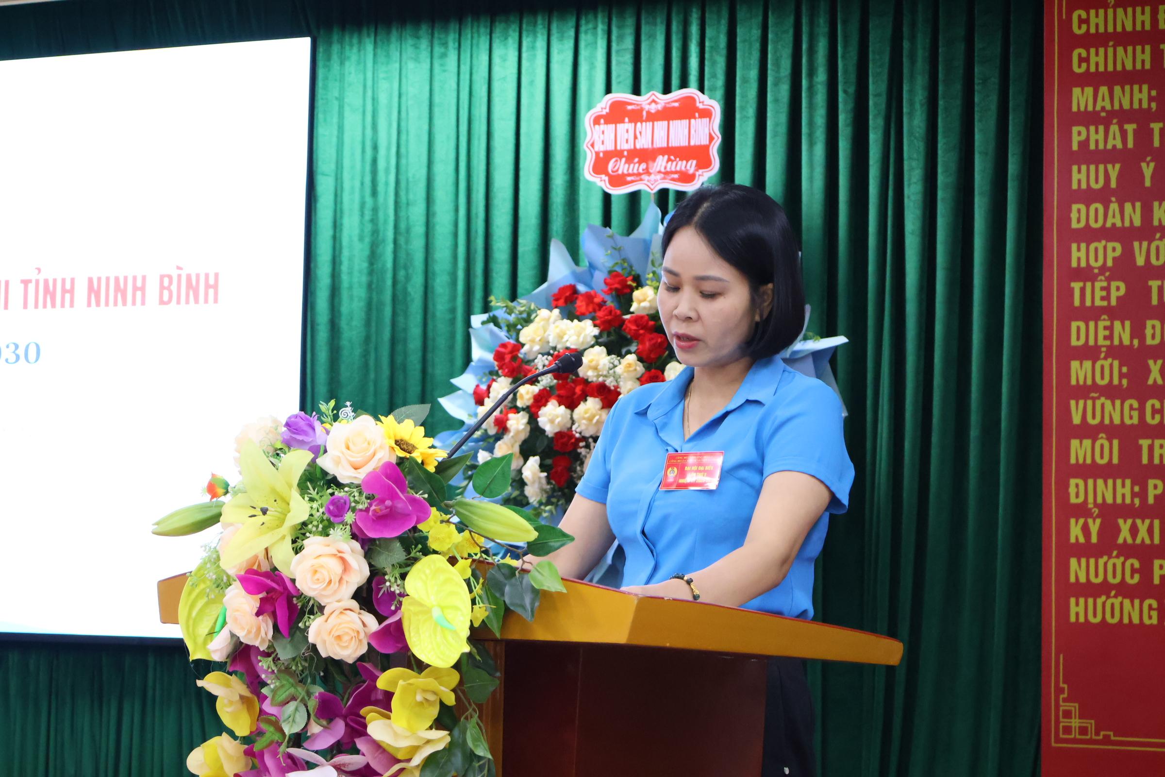 Cũng tại Đại hội, đồng chí Đinh Thị Đào – Chủ tịch Công đoàn Phường Hoa Lư đã ghi nhận, biểu dương những kết quả nổi bật mà Công đoàn Bệnh viện đạt được trong nhiệm kỳ qua, đồng thời cũng nhấn mạnh, trong thời gian tới CĐCS Bệnh viện cần tiếp tục thực hiện tốt vai trò đại diện, chăm lo và bảo vệ quyền, lợi ích hợp pháp chính đáng cho VCNLĐ. Tích cực học tập nâng cao trình độ chuyên môn, kịp thời khen thưởng, biểu dương các gương sáng. Đẩy mạnh phong trào thi đua, thi đua phải gắn với thực hiện nhiệm vụ chuyên môn, từ đó nâng cao chất lượng hiệu quả hoạt động của CĐCS, góp phần hoàn thành tốt nhiệm vụ chính trị của đơn vị và ngành Y tế.