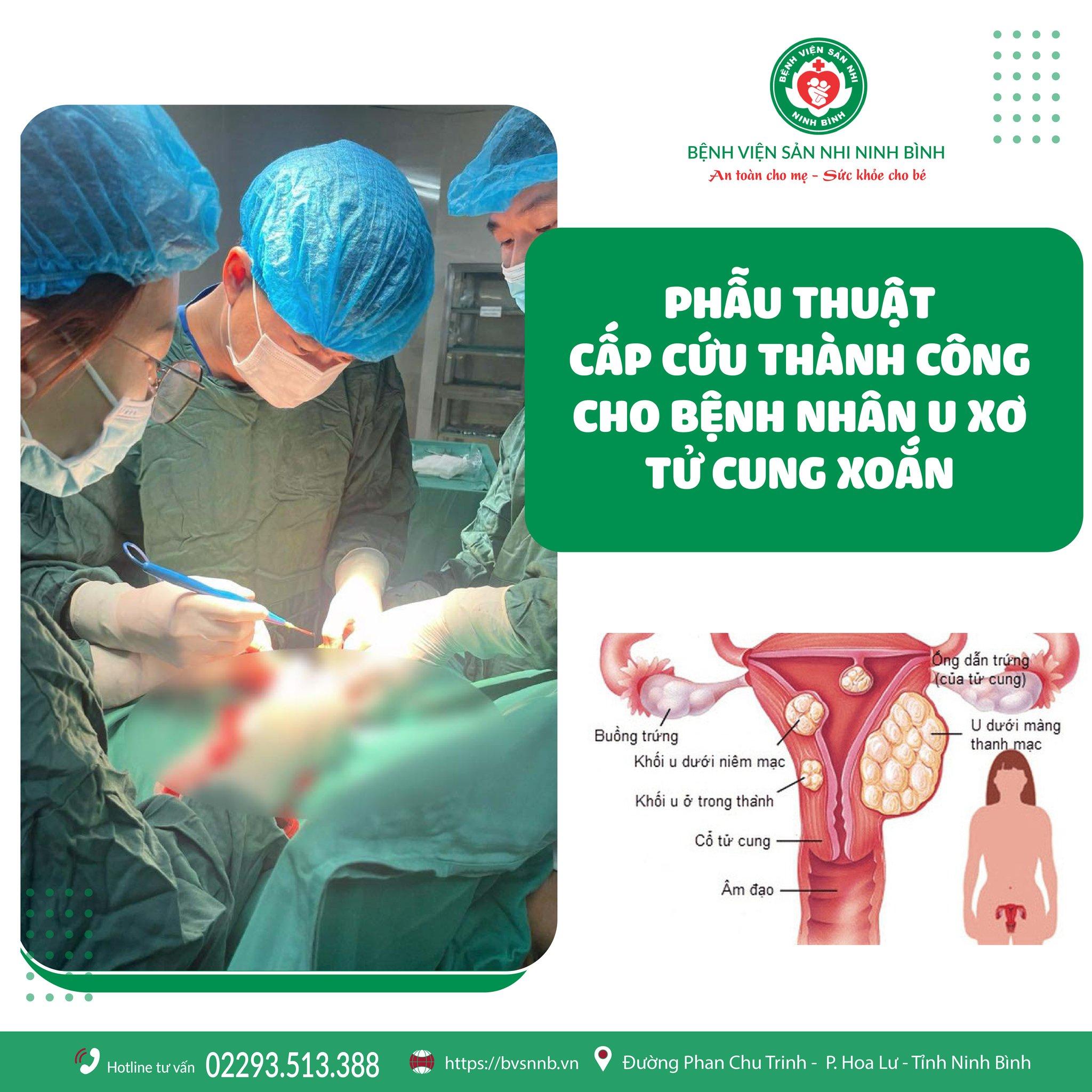 Vừa qua, Bệnh viện Sản Nhi tỉnh Ninh Bình đã tiếp nhận trường hợp bệnh nhân Q.T. T, 37 tuổi, tiền sử đẻ thường 2 con, kinh nguyệt đều. Bệnh nhân không chậm kinh, có biểu hiện đau bụng trong 3 ngày, sau đó đau tăng dần, vào khám tại Bệnh viện Sản Nhi tỉnh Ninh Bình được chẩn đoán: U xơ tử cung dưới thanh mạc xoắn và được chỉ định mổ cấp cứu chỉ sau 20 phút thăm khám.